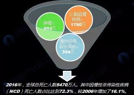 根據2016全球疾病負擔研究(Global Burdenof Disease Study 2016,GBD)公布的數據顯示,2016年全球總死亡人數為5470萬人,其中死于慢性非傳染性疾病(NCD)人數占比達到72.3%,總人數為4004萬人。2016年慢性非傳染性疾病(NCD)死亡人數較2006年增加了16.1%。 2016年,造成最多死亡人數的三類死因為:心腦血管疾病-1760萬;腫瘤-893萬;慢性呼吸系統疾病-354萬。